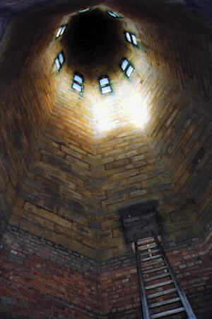 More steep steps lead to the belfry, being very careful not to hit ones head on the girder that crosses the opening. This is lit by large louvered windows, and by the windows high up in the spire. |