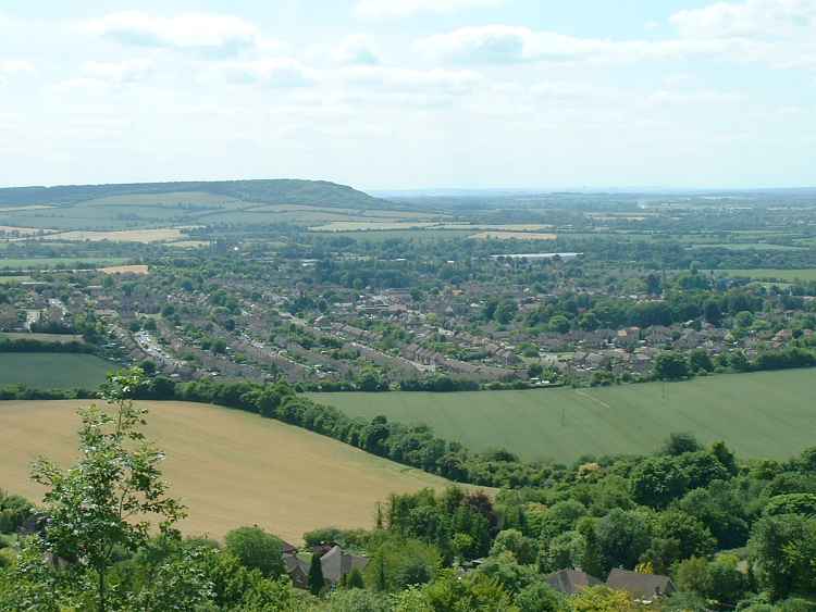 The view from the top of Whiteleaf Cross looking over Princes Risborough. In the middle distance is the grey roof of the new Ercol furniture factory. Bledlow Hill is to the left and the Berkshire Downs on the far horizon.